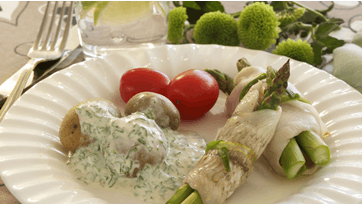 Skyl aspargesene og bræk den træede ende af. Drys rødspættefileterne med salt, peber og citronskal. Halver forårsløget på langs og skold strimlerne. Læg 2-3 asparges på hver filet, pak den omkring aspargesene og bind med strimler af forårsløg. Læg rødspættefileterne i et ovnfast fad, tilsæt lidt vand og damp den i ovnen ved 150° i 20 min. Rør cremefraichen med dild, citronmelisse, salt, peber og citron. Server med kogte kartofler og friske tomater.
