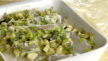 Læg fiskene i et ovnfast fad. Skær courgetten i små tern og steg dem grundigt i olie. Skær løgene i ringe og steg med i 10 sek. Tag det op. Snit spidskålen fint og vend den i panden til allersidst. Må ikke brune. Kom kål i bunden under fisken. Læg courgette over, drys med de grønne dele af løget og hæld vin ved. Sæt i ovnen i 3 min. ved 220°. Hæld så fløden ved og fortsæt i 7 min. Server med kogte ris.