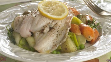 Rens alle grønsagerne og skær dem i mindre stykker, der passer til frikassé. Sauter dem i smør. Hold dem varme. Læg fisken i et fad og kom vin, salt, peber og smør over. Kom et par dildkviste ved. Sæt det i ovnen ved 225° i 4-5 min., til overfladen tager farve af smørret, og resten af fisken er dampet. Drys mel over grønsagerne og spæd med lagen fra fisken. Kog lige igennem, uden at grønsagerne mister deres bid. Kom masser af hakket dild ved. Anret fisken på toppen.