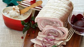 Skær slaget til, så det danner en pæn firkant og er ensartet tykt. Bland salt, krydderier og løg og fordel det jævnt over slaget. Rul slaget sammen til en stram roulade. Hold pølsen sammen med kødnåle og snør den med kødsnor.