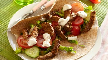 Skær kødet i strimler, bland det med krydderier, eddike og olie og lad kødet marinere i mindst et par timer på køl. Fordel kødet i et smurt, ovnfast fad og steg det ved 250° i 7 min., vend kødet og steg det i yderligere 5 min. Lun brødene, snit salaten og skær tomater og agurk i skiver. Servér brødene rullet sammen med kød, salat, tomat, agurk, chilisovs og dressing.