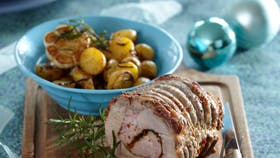 Krydr rullestegen med salt og citronpeber, læg den i et ovnfast fad og steg den ved 200° i 60 min. Kog kartoflerne i letsaltet vand i 12 min. og lad dem dryppe godt af. Flæk hvidløget på tværs og steg det med snitfladerne nedad i olien på en varm pande i et par min. sammen med rosmarin. Kom kartofler, revet citronskal og 1 spsk. citronsaft ned til hvidløget og lad dem riste, til kartoflerne begynder at tage farve. Servér rullestegen med kartoflerne og en god salat.