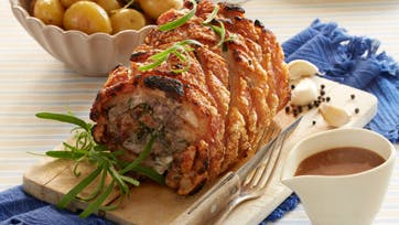 Læg stegen på en rist med en bradepande med vand under og sæt den i ovnen ved 150° i 2½ time. Vend rullestegen et par gange undervejs og giv eventuelt sværen lidt grill til sidst for at gøre den ekstra sprød. Kog stegeskyen op, rør melet ud i lidt vand og jævn skyen. Tilsæt eventuelt kulør, smag sovsen til med salt og peber og servér med rosmarinkartofler og