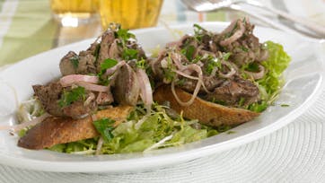 Skyl salaten og lad den dryppe af. Rens den optøede kyllingelever og hold dem i pæne, store stykker. Mariner løg, kapers og persille i lidt olie og eddike. Rist brødet. Steg leveren i resten af olien og drys med salt og peber. Når leveren er brunet, vendes marinade med grønt i panden, og så skal den derefter have ca. 6 min. ved reduceret varme, så den akkurat er gennemstegt, men ikke tør. Tjek et af stykkerne. Læg leveren på de ristede brødstykker og anret på salaterne, der blandes i to store serveringsskåle. Kan pyntes med lidt mere bredbladet persille.