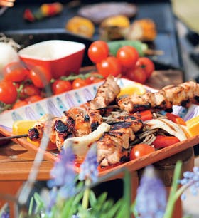 Skær kyllingefileterne i mindre stykker. Bland resten af ingredienserne i en skål og rør rundt. Læg kyllingestykkerne i marinaden og lad dem trække i mindst 30 min. Blødgør spiddene i vand. Sæt kyllingestykkerne på spiddene og grill dem i ca. 10 min.