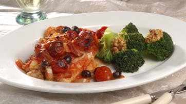 Kom tomater og krydderier ved og lad det simre ved svag varme i 15 min., til det er tykt. Hæld over fisken, pynt med oliven og stil i ovnen ved 210° i 8 min., til fisken er akkurat gennemkogt. Damp broccoli i saltet vand i 3 min. og drys med nødder, citronsaft, salt og peber
