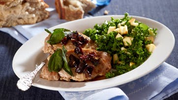 Pil ca. 20 pæne salvieblade fra bundet og hak yderligere 10. Steg de hele blade i olie på en pande, til de er sprøde. Lad dem dryppe af på fedtsugende papir. Skru ned for varmen og kom løget, hakket salvie og knust peber på panden og vend det sammen. Sluk for panden. Skær lommer ind i hver kotelet og fyld løg og salvieblandingen heri. Steg koteletterne 2-3 min. på hver side, til de er brune. Drys dem med salt og peber. Kom vin og svesker ved og skru ned for varmen. Kom alufolie hen over og lad det simre i 15 min. Læg sveskerne på koteletterne og kom dem i et varmt fad. Jævn skyen med fløde og hæld den ved og drys med sprøde salvieblade. Serveres med en grønkålssalat med pærer eller æbler og en senneps vinaigrette samt brød.