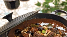 Rødvin og tomatsovs hældes ved kødet, og der tilsættes pancetta igen. Buketten lægges ved, og grønsagsblandingen lægges øverst. Låg på, og gryden småsimrer i 2½ time ved meget lav varme.