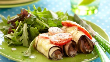 Skær auberginerne i tynde skiver på langs. Drys skiverne med salt og lad dem ligge i 15 min. for at trække væsken ud. Rør kødet med æg, rasp og tomatpuré. Hak sardeller og hvidløg fint og rør det i farsen sammen med krydderierne. Skyl aubergineskiverne og læg en skefuld fars på hver. Rul auberginerne sammen om farsen og læg dem i et ovnfast fad. Læg tomatskiver over rullerne og drys med osten. Bag rullerne i ovnen ved 200° i 25 min. og servér med grøn salat.