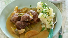 Brun kæberne godt i en gryde i olien og giv dem salt og peber. Tilsæt tomatpuré, laurbærblade, timian og æblemost. Lad det simre ca. 1 time under låg. Rens og skyl porrerne og skær dem i 2 cm tykke skiver. Skær æblerne i både. Kom det i gryden og lad det simre ca. 20 min., til kæberne er meget møre. Smag til med salt og peber.