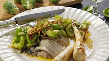 Begynd med rosenkålen, hvor alle de grønne blade pilles af, til den lille bitre kerne i midten er tilbage. Den kasseres. Persillerødderne skrælles og småsimrer i lidt olie i en gryde med låg i 10 min. Bland appelsinsaft, -skal og honning. Hæld det ved, lad det simre yderligere 10 min. og smag til med salt og peber. Steg rosenkålen i det meste af smørret, efter at du har brunet mandelflagerne, drys med salt og peber. I en pande vendes fileterne i lidt brunet smør. Rosenkålen lægges over og persillerødderne gives til som basis.