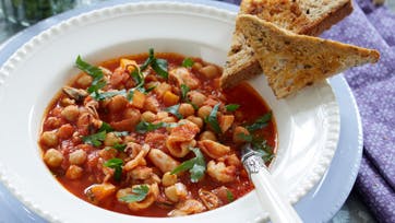 i 25 min. Kassér kogevand og urter, men gem ærterne. Kom olien i en stor gryde og tilsæt de finthakkede grønsager heri. Pil og hak hvidløgene, kom dem i gryden og lad det småstege i 10 min. Kom ærter, tomatpuré og timian i gryden og lad det koge igennem i 2 min., hæld tomatsovs og bouillon ved og lad det koge i 25 min. Tilsæt skaldyrsblandingen og kog videre i 10 min. Skyl og hak persillen og drys over retten lige inden servering.