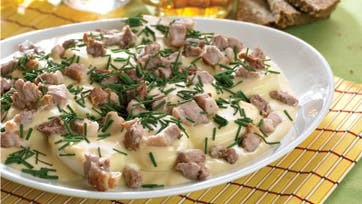 Kog æggene 7 min. (smilende). Rist tern af flæsk på pande og hæld fedtet fra. Afbag smør og mel og spæd med mælk. Kog igennem med salt og peber. Sluk og smag til med sennep. Kommes i et fad og læg halve æg i sovsen, drys med flæsketern og hakket purløg. Giv evt. rugbrød og øl til.