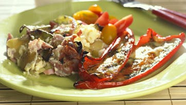 Skær kartoflerne i mundrette stykker og fordel dem i bunden et smurt ovnfast fad. Skær begge typer skinke i strimler og fordel dem over kartoflerne sammen med hakket forårsløg og halverede sukkerærter. Pisk æggene med fløde, salt og peber, hæld det over kartoflerne og bag retten ved 200° i 30 min. Halver snackpeberne og fjern kernerne. Bland smør, hakkede krydderurter og salt, fordel det i pebrene og læg skiver af mozzarella over. Bag peberne i ovnen i 10 min. og server med tomater, gerne de små i forskellige farver.