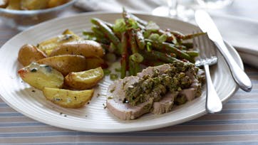 Skær et dybt snit i toppen af mignonen, bland champignon med pesto og fyld det i snittet. Skær bagekartoflerne i både og krydder dem med salt og peber. Kom dem i en bradepande og steg dem sammen med stegen i 35 min. ved 200° Nip og blancher bønnerne i letsaltet vand, lad dem dryppe godt af. Rør olie, tomatpuré, presset hvidløg og hakket forårsløg sammen og smag til med salt og peber. Kom marinaden over de varme bønner og lad dem stå 10-15 min. Smuldr gorgonzolaen over kartoffelbådene og bag dem i yderligere 5 min. og server.