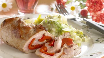 Grill peberfrugterne, til skindet er sort, læg dem i en frostpose og lad dem afkøle. Læg oreganoblade på snitslerne og krydr med salt og peber. Gnid skindet af peberfrugterne, halver dem og fjern kernerne. Fordel peberfrugten over snitslerne, rul dem sammen og hæft enderne med en tandstik. Steg rullerne ved middelhøj varme, til de er gyldne og netop gennemstegte. Snit porrerne og svits dem let i smørret. Tilsæt oregano, mælk, muskatnød, salt og peber og lad det koge op. Rør cremefraichen med majsstivelse, smag til og server med kogte kartofler.
