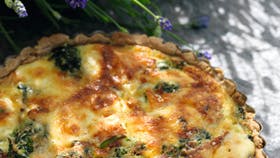 Svits løg, hvidløg og chili i smør. Hæld æggeblandingen over og steg, til massen er halvfast. Hæld alt over piebunden. Bag pien 30 min. på 180° midt i ovnen.