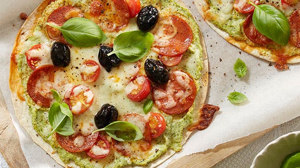 Hvis det skal gå lidt hurtigt med aftensmaden, så skift pizzadejen ud med fladbrød - vi garanterer, at det stadig bliver en skøn pizza.