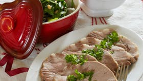 Lad den simre under låg ved svag varme 1-1¼ time, til stegen er gennemstegt, ca. 80°. Pak den i alufolie.