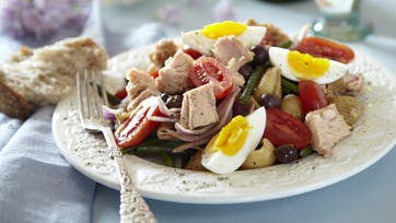 Kog pastaen i letsaltet vand efter anvisning på pakken. Kog bønnerne med de sidste 6 min. af kogetiden. Dræn begge dele og hæld over med koldt vand. Pisk dressingen sammen i en skål og vend den varme pasta og bønnerne i. Kog æggene smilende, ca. 7 min. Skær rødløget i smalle både. Skær eller pluk tunen i mindre stykker og halver tomaterne. Bland salaten og pynt med oliven og halverede æg. Server med fyldigt brød til.