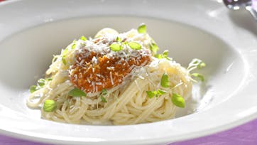 Spaghettien lægges i en dyb tallerken, og der hældes en portion ketchup ovenpå. Retten drysses med fintrevet parmesan og evt. frisk krydderurt, f.eks. merian.