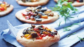 Opløs gæren i vand, tilsæt salt, olie og mel, til det kan æltes. Bliv ved med at ælte, mens dejen mættes med mel. Ælt i 10 min. Lad dejen hvile i 1 time. Drys imens auberginerne med salt (ryst dem i en pose) og lad dem dryppe af i en sigte i ½ time. Skyl dem let og steg dem i varm olie, til de er gyldne i overfladen. Tilsæt løg, rød peber og rosmarin. Lad det stege i 10 min. Del dejen i 8 stk. og lav små, flade cirkler og fyld op med grønsagerne. Bag ved 230° i 20 min., til de er helt sprøde og lysebrune. Server med grøn salat.