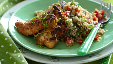 Bland ajvar, honning, olivenolie, fintrevet limeskal, salt og peber, vend kyllingefiléterne deri og lad dem trække i mindst 15 min.