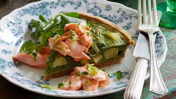 Hæld fyldet i den forbagte tærte og bag den ca. 30 min. ved 190°, til æggemassen er fast.