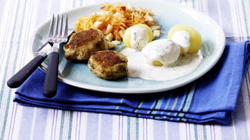 Hak fileterne groft og løget fint. Rør fiskekød, løg, mel, æg, dild, salt og peber sammen og rør mælken i lidt efter lidt. Form farsen til frikadeller og rul den i raspen. Steg dellerne i olien ved middelhøj varme i 6 min. på hver side, til de er gyldne og sprøde. Rør flødeost og mælk sammen og lad det koge op. Tilsæt sennep, dild, salt og peber og smag sovsen til. Server med kogte kartofler og en god råkost.