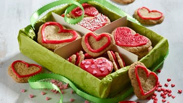 Hak mel og smør sammen til en grynet masse. Hak nødderne fint og bland dem med sukker og hjortetaksalt. Tilsæt det hele i melmassen og ælt dejen godt igennem. Udrul dejen i 3 mm tykkelse og udstik kagerne med en hjerteform. Læg kagerne på en plade med bagepapir og bag dem midt i ovnen ved 200° i 7-8 min., til de er gyldne. Lad kagerne afkøle på pladen og rør imens flormelis med citron og frugtfarve til en glat konsistens. Dekorer kagerne med glasuren og drys med krymmel.