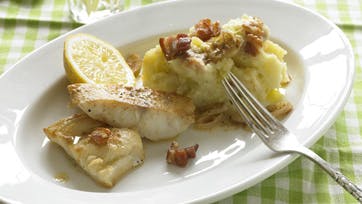 Kog kartofler i mindre stykker i usaltet vand. Mos med en gaffel eller en moser sammen med smør og lidt fløde, hvis du har det. Ikke mælk - det bliver ikke så blødt med mælk. Damp strimlet kål og rist bacon og løg i lidt mere smør og fedtet fra baconen. Rør løg, kål, det meste bacon og sennep i mosen og hold varm. Steg fiskestykkerne, drysset med salt og peber, i smør ca. 2-3 min. på hver side, til der er brun overflade og fisken lige er blevet fast.