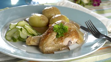 Parter kyllingen og server med nye kartofler og agurkesalat.