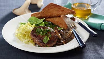 Ælt kødet med æggeblomme, trøffelolie, lidt salt og peber og form det til 2, flade bøffer. Skær brødet over diagonalt og rist det gyldent på panden i smør. Rens svampene og skær dem i grove stykker. Rist dem gyldne i smør med salt og peber. Steg tataren 2-3 min. på hver side alt efter tykkelse. Damp ærterne 1-2 min. Anret tataren med salat, hakket persille, svampene, brød og ærter. Sæt trøffelolie på bordet, så man selv kan dosere ekstra.