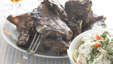 Del benene i passende stykker og kog dem i vand tilsat salt, peberkorn, laurbærblade, løg og nelliker i 30 min. Rør cremefraichen med purløg, løg, sennep, salt og peber. Skær kartoflerne i skiver og vend dem i dressingen. Pisk olie, honning og tabasco sammen til en marinade og smør den på de kogte ben. Steg benene færdige i ovnen 225° i 20 min. og server med en god agurkesalat.