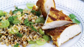 Skyl salat og stikkelsbær og vend dem i byggen sammen med hele blade af persille og server det til kyllingebrystet med både af citron.