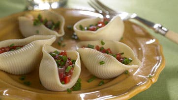 Kog pastaen i rigelig saltet vand efter pakkens anvisning. Skyl den i koldt vand, og lad den dryppe godt af. Skær tomater, agurk og pillet finthakket rødløg i små tern og bland dem med de øvrige ingredienser. Smag til med salt og lad det trække 10-15 min. Hæld væden fra tomatsalaten og fyld den i pastaen. Læg dem portionsvis eller på et fad og pynt med persille. Kværn peber over og spis brød til.