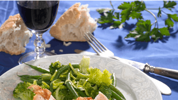 Tag skindet af kyllingebrysterne og gnid dem med sukker og salt. Lad dem trække, mens grønsagerne laves. Porren renses og skæres i meget, meget tynde skiver, der i salatskålen blandes med citronsaft og salt. Trækker sådan, mens bønnerne laves. Bønnerne renses, nippes og koges i saltet vand i 4 min. Broccolien deles i små buketter, der smides oveni bønnerne, så de koges 1 min. mere. Sluk og hæld vandet fra og hæld koldt vand på, så kogningen standses. Vendes i citron-porren med olivenolie. Kyllingebrysterne sættes i ovnen ved 225° i 8 min., til sukkeret er smeltet, og serveres med strimler af ristet kyllingeskind, grønsagerne og en risblanding.