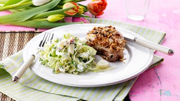 Server med persilleslaw, der røres sammen af meget fintsnittet spidskål, æble i tern, hakket persille, mayonnaise, ymer, sennep og honning.