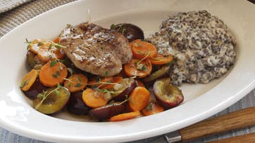 Drys medaljonerne med salt og lad dem trække, mens du gør resten klar. Kog linser i letsaltet vand i 15-20 min. Smag til med salt, peber, lidt peberrod og cremefraiche. Halver blommerne og fjern stenen. Skræl gulerødderne og skær dem i skiver. Hak løget. Kom 1 tsk. olie i en dyb pande og steg løg og gulerødder ved middelvarme i 5 min. Drys med salt, peber og timianblade. Smag til med lidt citronssaft. Vend blommerne i og steg videre i 3 min. Steg kødet på grillpande ved høj varme i 3 min. på hver side. Server med linserne som tilbehør.