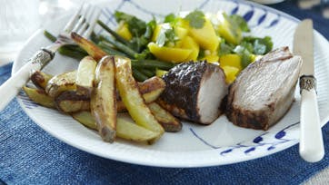 Bland nibs med sukker, kakao, peber og krydderier til en slags rasp. Vend mørbraden i det og steg den i lidt fedtstof ca. 2 min på hver side. Sæt den i ovnen i 10-15 min. ved 200°, til den er akkurat gennemstegt. Skræl mangoen og skær den i tern. Hak løget og bland det med mangoen, friske korianderblade og lidt limesaft. Blancher bønnerne og vend dem i limesaft og olivenolie. Server med ovnstegte fritter.