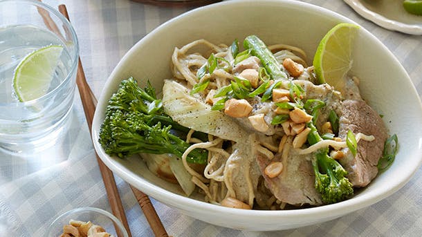 Skær fenniklen i tynde både og kom dem i gryden sammen med broccoli, nudler, kokosmælk og oystersauce.