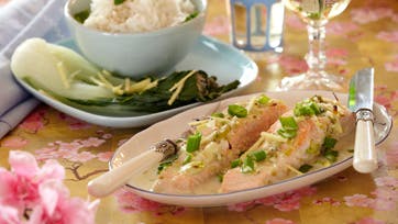 Rens og skræl citrongræs og ingefær, gem halvdelen til senere brug, og chili og blend det med limesaft og skal, gem lidt limeskal til pynt. Skær resten af ingefæren i tynde strimler og bland dem med kokosmælk, fiskesovs, den blendede kryddermasse og farin. Skær forårsløgene i tynde skiver på skrå, kom halvdelen i kokosmælken og varm den op, til den simrer, den må ikke bulderkoge. Læg fisken i et ovnfast fad, drys med salt og peber og hæld den varme kokosmælk over. Læg alufolie over fadet og sæt det i ovnen ved 170º i 15 min. Pynt med lime og resten af forårsløgene. Servér med kogte ris og dampede grønsager.