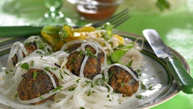 Pil løgene og skær dem i tern. Udkern chilien og hak den fint. Kom kødet i en skål og bland det med løg, chili, ingefær, lime, østerssauce, fiskesauce og sesamfrø. Form den løse fars til små boller med fugtige hænder. Varm olien på en slip let-pande og brun bollerne 5-6 ad gangen. Ryst panden, så bollerne forbliver runde. Steg dem færdige på ca. 5 min.