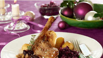 Læg anden på rist over bradepanden med ryggen opad. Sæt den i ovnen ca. 15 min. ved 225°. Vend anden, hæld ½ l vand ved og steg den ca. 2 timer ved 160°. Stik i den tykke del af låret, kød-saften skal være klar.