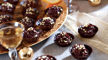 Kog fløde og smør op, hak chokoladen og rør den i. Tilsæt farin, appelsinskal og Cointreau og rør, til chokoladen er smeltet, og massen er glat. Stil trøffelmassen i køleskab i en time, kom den i en sprøjtepose, fyld i chokoladeskallerne og pynt med krymmel.