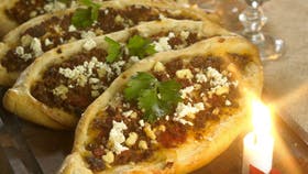 Gær, vand, olie, salt og surmælk røres sammen, og halvdelen af hveden kommes i sammen med to æg, der piskes let sammen. Resten af melet tilsættes lidt ad gangen, og dejen æltes meget smidig i ca. 10 min. Hæver en time. Fyldet steges i stor stegepande lidt ad gangen, til det hele er godt sammenkogt. Pizzaerne rulles ud til aflange let tilspidsede pakker med høj kant og fyldes med kødsovsen. Bages ved 230° i ca. 10 min., til dejen er helt lysebrun i kanten. Drysses med hakket mynte, ost og olie og serveres med citron. Også disse kan laves i rigtig god tid og fryses og lige lunes, når det er spisetid. Pynten gemmes dog til serveringen.