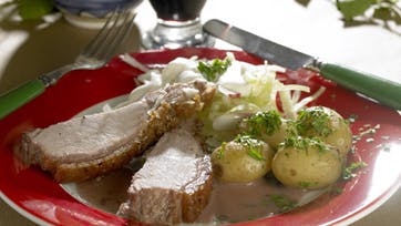 Gnid stegen med salt og provencekrydderier og læg den i en mellemstor bradepande. Tilsæt rødvin, vand, gulerødder og løg skåret i mindre stykker. Sæt den i ovnen ved 160° og beregn ca. 1¼ time, til et stegetermometer i stegens midte viser 62°. Tag bradepanden ud og si skyen ned i en gryde. Efterbrun stegen ved 250°, til den er sprød. Kog skyen lidt ind og jævn med saucejævner. Smag til med gelé, salt og peber. Server med kålsalat.
