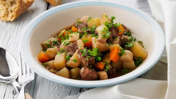 Svits løg og hvidløg i lidt olie, til de er klare. Tilsæt kødet sammen med paprikaen og brun det af. Hæld bouillon og rødvin ved kødet og lad det hele simre i 20 min. Skær kartofler, pastinak og gulerødder i tern, kom dem ned til kødet og lad det simre i yderligere 20 min. Tilsæt fløde og ærter og kog retten igennem. Smag til med salt og peber og server retten med hakket persille og groft brød.