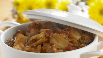 Hak løgene og skær rodfrugterne i 1 cm store tern. Skær kålen i mindre stykker og hak hvidløgene fint. Svits grønsagerne i olien i et par min., uden de tager farve. Tilsæt de flåede tomater sammen med vand, oregano, timian, salt og peber og lad det småsimre under låg i 15 min. Smag ratatouillen til og server.