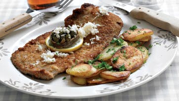 Skær kartoflerne i skiver og svits dem let i olien. Læg låg på panden og lad dem steg videre i 15 min. Bank kødskiverne let og vend dem i sammenpisket æg og herefter i rasp blandet med salt og peber. Steg snitslerne gyldne i smørret, ca. 4 minutter på hver side. Tag låget af kartoflerne, steg dem sprøde i smørret og smag til med salt og peber. Anret snitslerne, pynt med en citronskive, herpå en ring af ansjosfileter fyldt med kapers og peberrod.